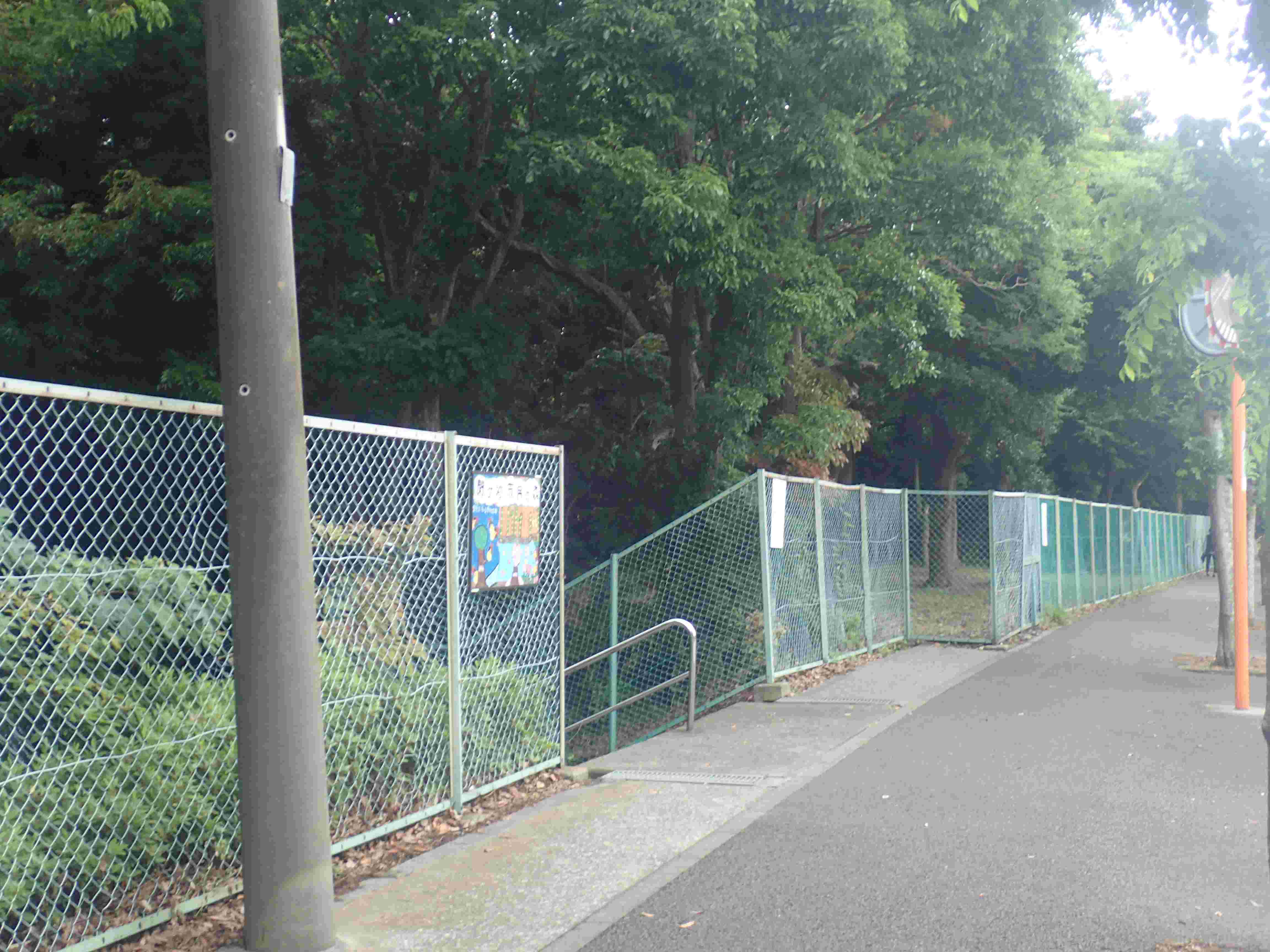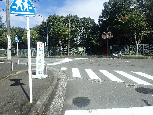 降車して左に進むと大学正門があります。その向かいのフェンスに2つのカーブミラーと入口の案内板があります。