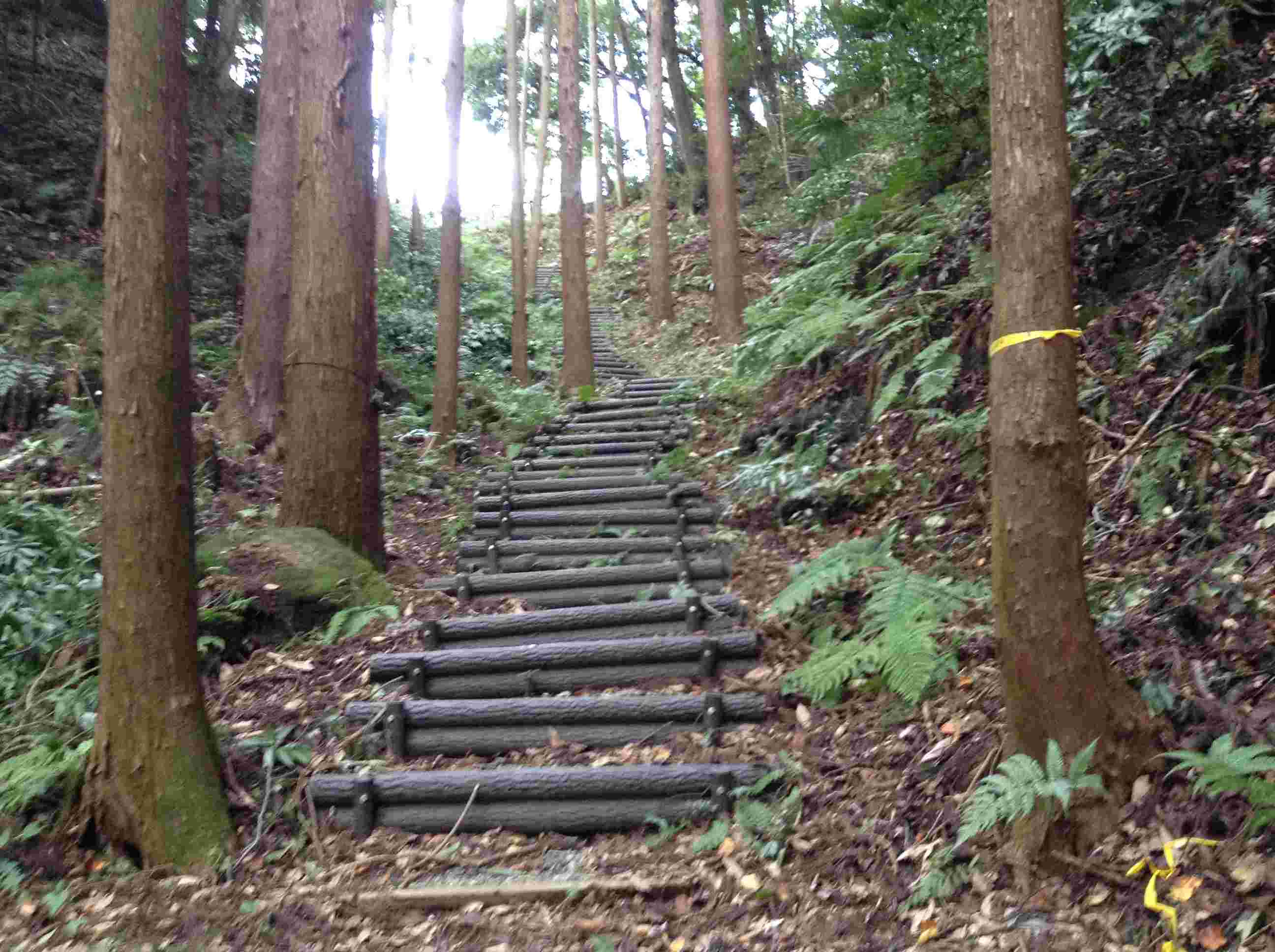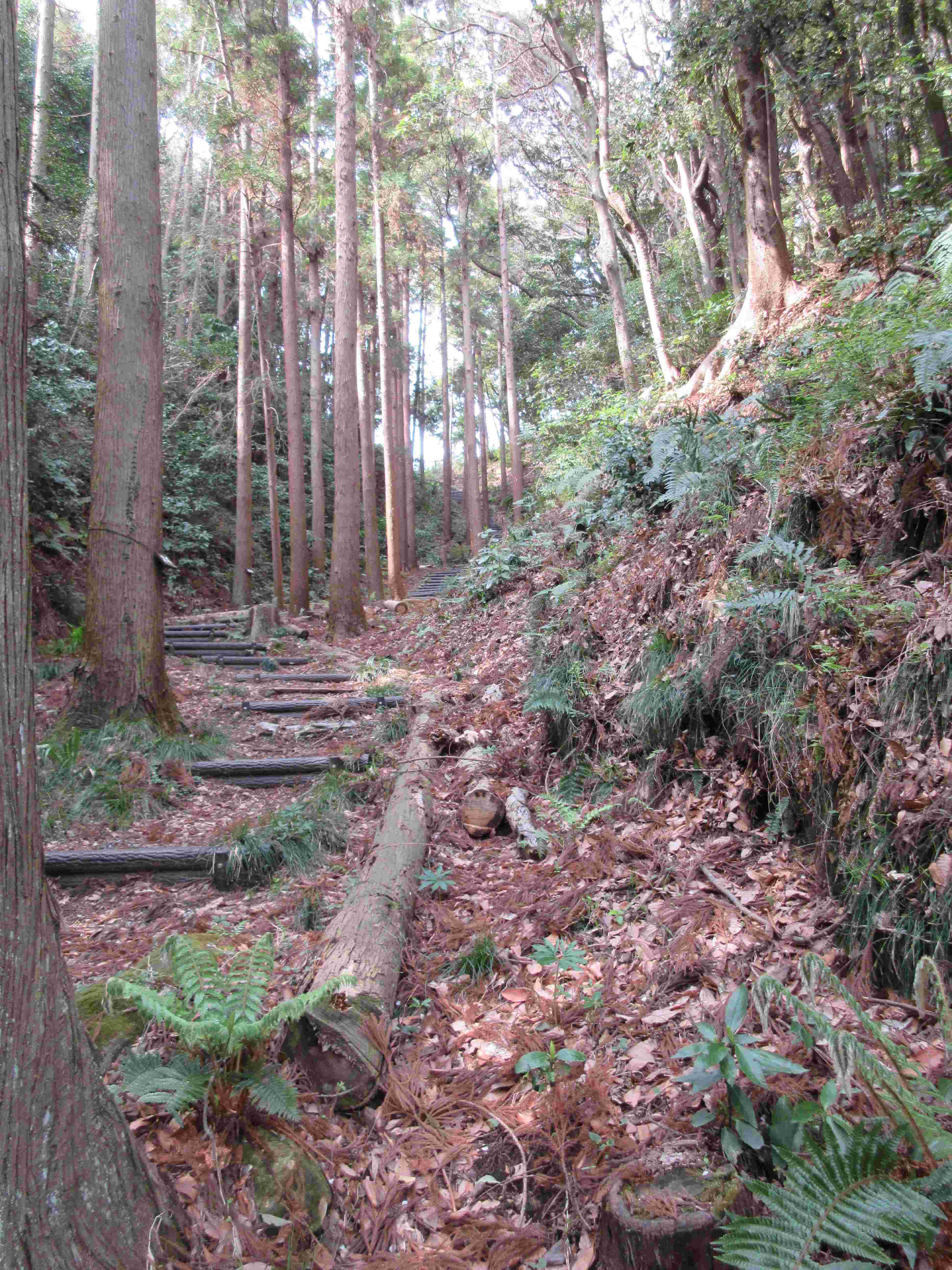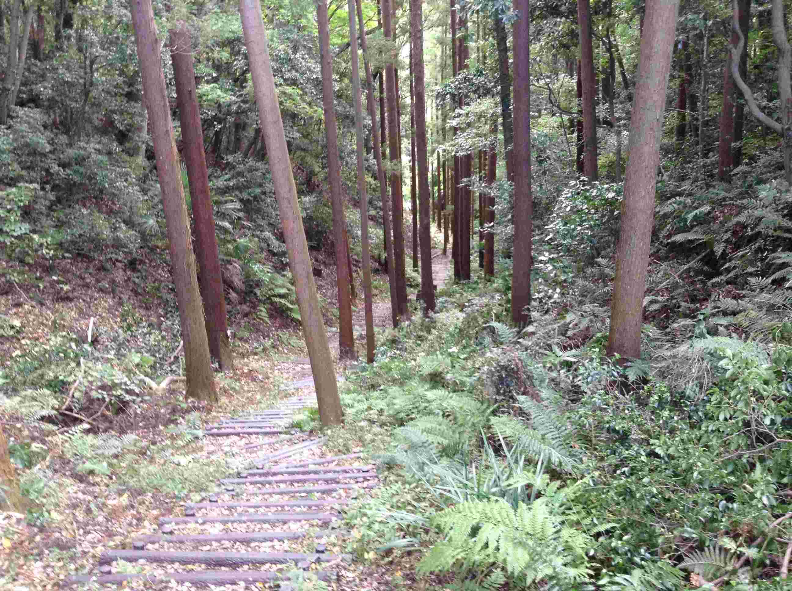 「いこいの広場」と「おいこし広場」をつなぐ散策路、西側の山道で頂上付近が少し急な坂をのぼる山道です。散策路は高い杉が両脇に立ちシダ植物を見ながらの気持ち良い散策路です。いこいの広場からの登り口から左側が「すぎこだちの道」右側「こもれびの道」です。