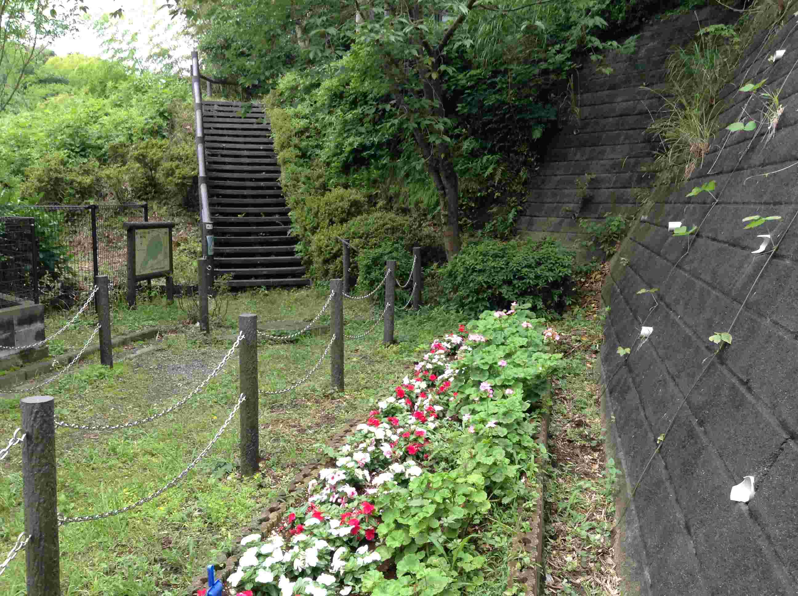 関ヶ谷の辻公園手前を左折する。 坂道を約500m下ると右手に山の手自治会館が見えます。 坂の右側の山の手自治会館を過ぎて、右手上に関ヶ谷市民の森看板がある分岐を右折する。 関ヶ谷市民の森の看板に向かって左側の道を石垣に沿って進むと、山の手入口となります。 分岐の左側の道 山の手入口の階段 花の季節には“園芸クラブ”のみなさんが丹誠込めてお世話をしている花壇が、あなたを優しく迎えてくれます。 山の手入口前看板 市民の森の案内へ トップページに戻る