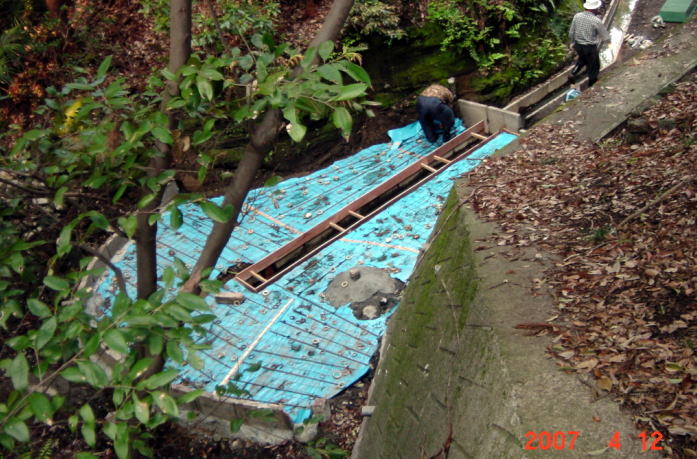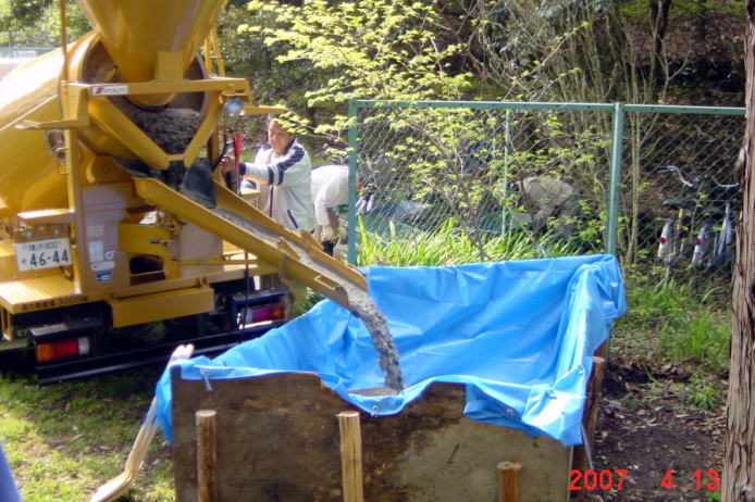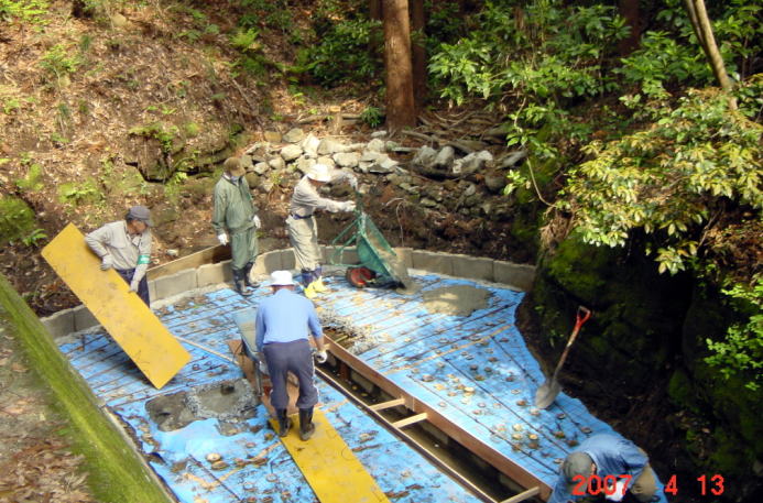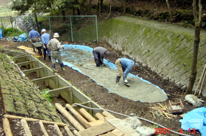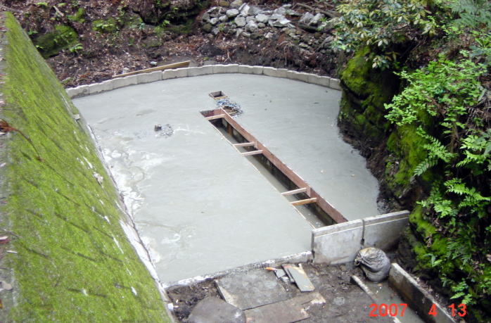 コンクリート打ちを明日に控え、準備完了した「追越の池」