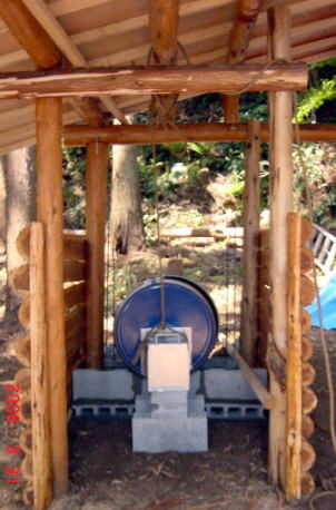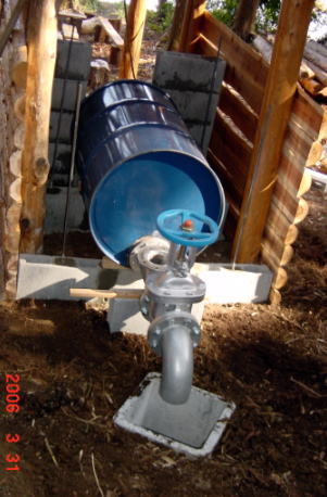写真奥の3個のブロックはドラム缶の出側が乗りますが、養生期間も考え前日にモルタル打ちまで済ませておきました。31日はここを基準に入側のブロックを決めていきました。