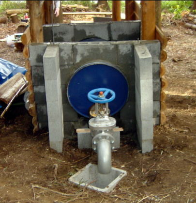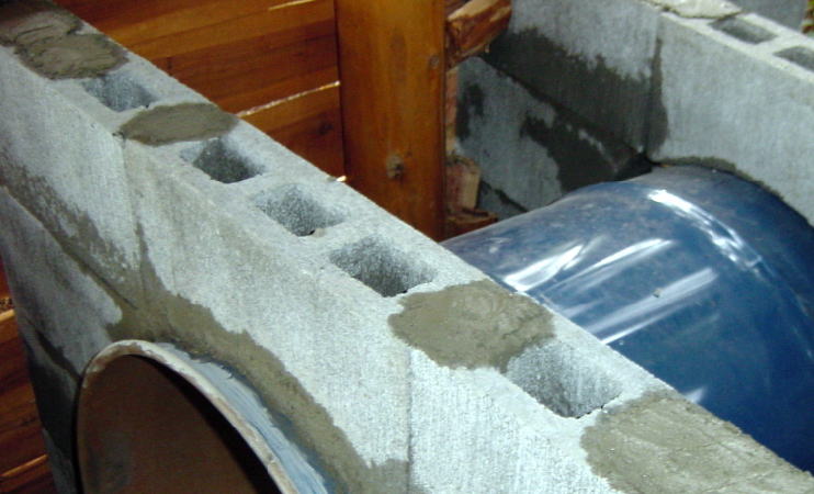 炭焼窯を3つのブロックに分けて据え付けました。即ち、①焚口側 ②中央部 ③出側 となります。分割理由は、中央部は土込めすれば殆どいじることはないだろうし、焚口部は炭焼素材搬入の都度土を搬出するからです。出側はドレンが詰まった時にオープンできるように配慮しました。