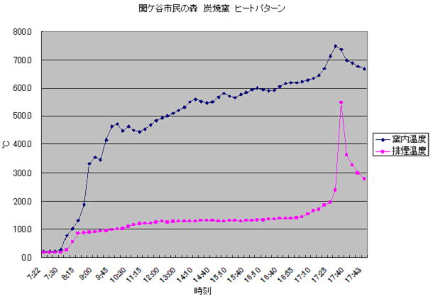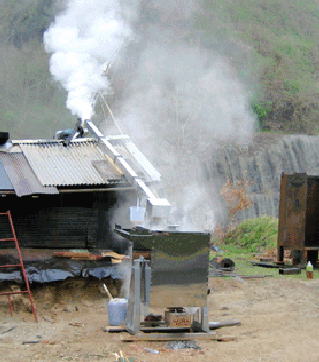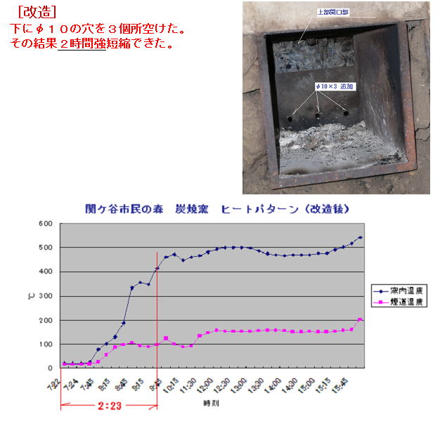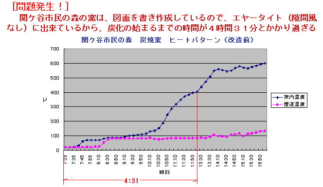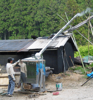<写真-1>の排煙ダクト長は4m、竹酢液採取量は6㍑、<写真-2>の排煙ダクト長は8m、竹酢液採取量は14~15㍑と排煙ダクトの長さが竹酢液採取率に大きく関与していることがわかります。また、排煙ダクトは、煙を熱特性の良いステンレス製排煙ダクトの中をより長く通過させ、煙の熱を奪い気体を効率的に液体(竹酢液)に変えています。煙突から排出される煙は殆どが水蒸気だから水分が少なくなれば、煙の量にも影響が出る筈です。 <写真-1>と<写真-2>を較べればはっきり違いがわかります。同時に排煙ダクトの勾配も検討する必要がありますが、関ケ谷市民の森愛護会のダクトの長さは10mにしました。