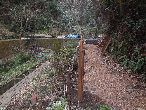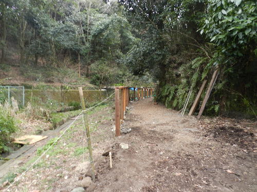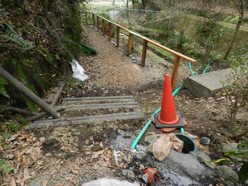 2007年4月に作成した観賞路が朽ちて危険になった為、せせらぎ水路の一部を新たに作成安全対策を2017年3月5日(日)より実施した。