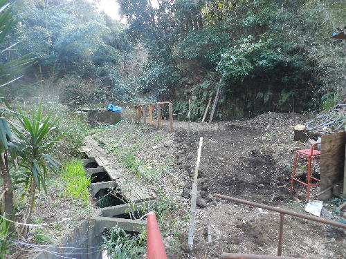 入口に向かって右側は切り株があり掘るのは難しいむしろそれを柱の支柱根本にしたらという案が出る。