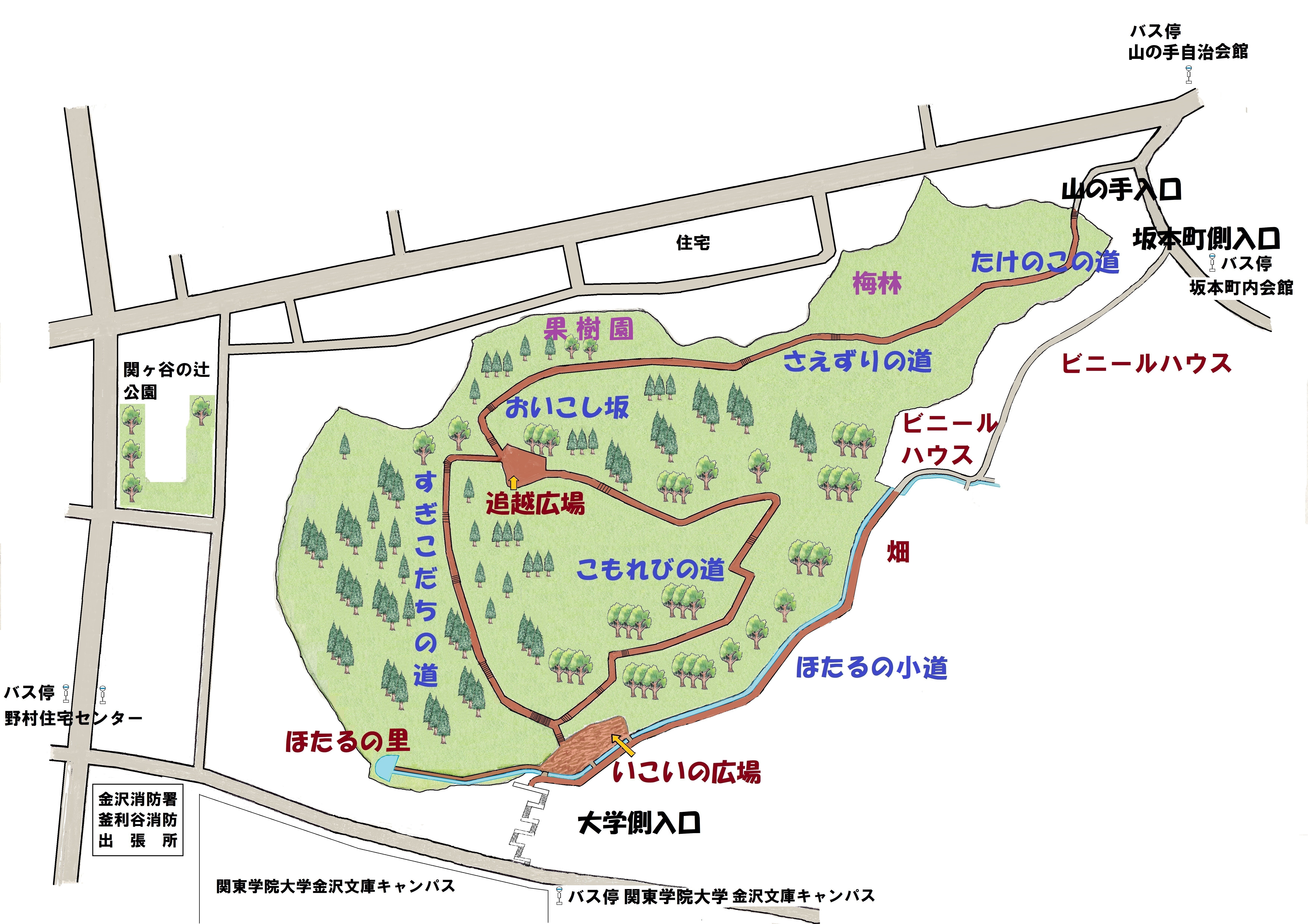 園内の入口案内 関東学院大学側入口 坂本町側入口 山山の手入口 園内の道案内 たけのこの道 さえずりの道 おいこし坂 こもれびの道 すぎこだちの道 ほたるの小道 園内の樹林、広場、里案内 竹林 梅林 果樹園 追越広場 いこいの広場 ほたるの里 やまゆりの里 炭焼広場 トップページに戻る